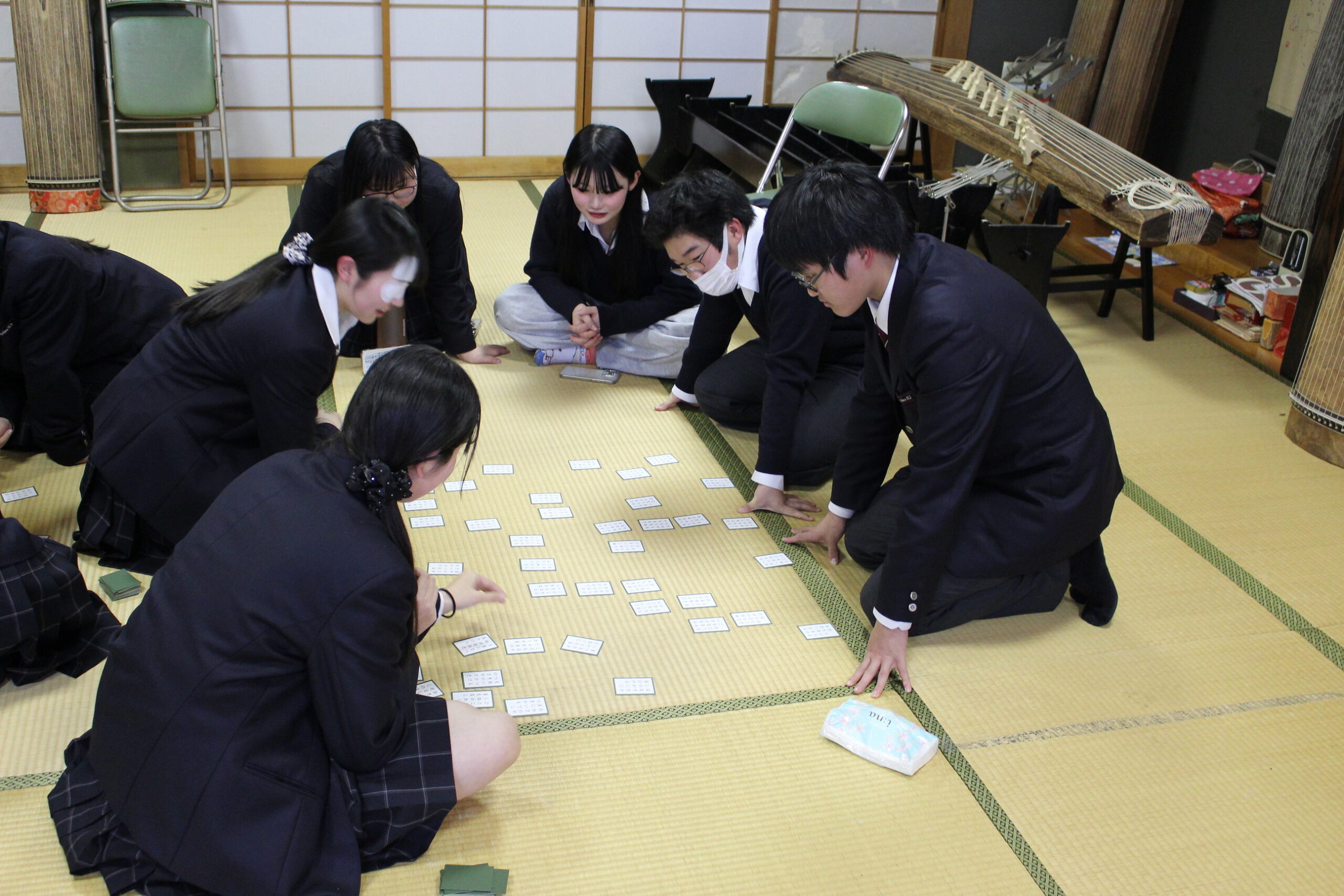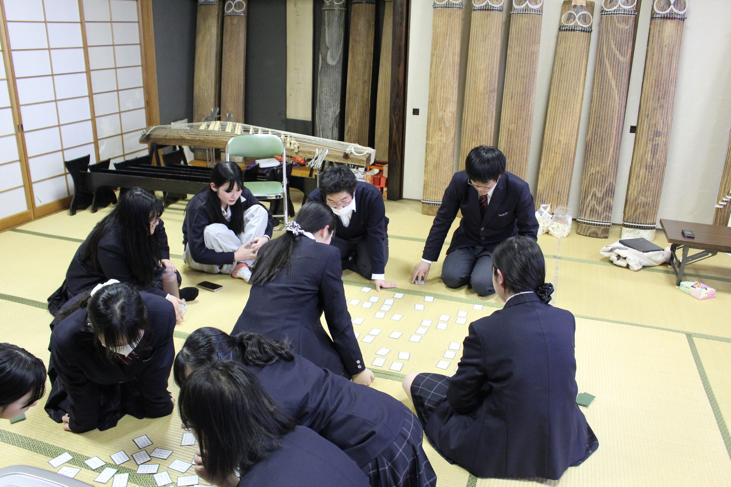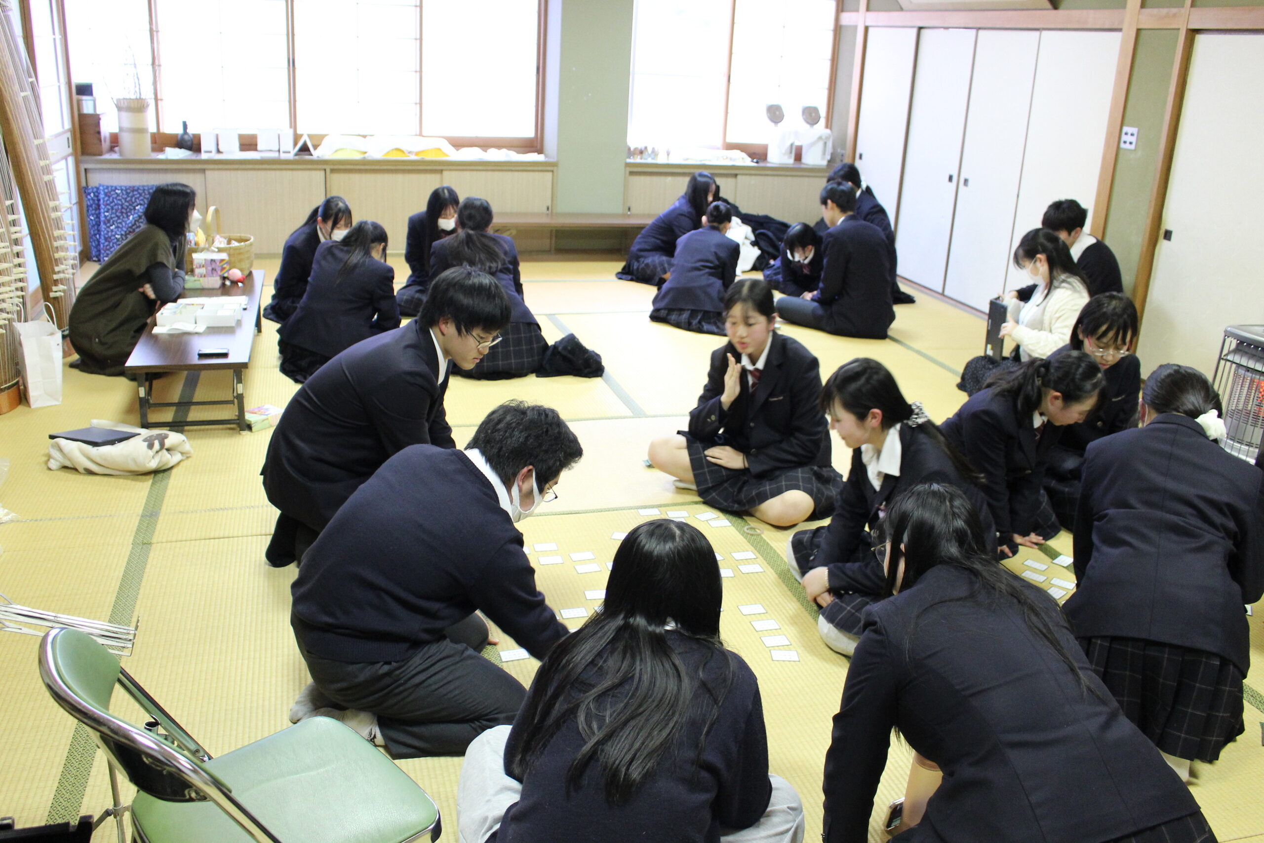 当日は特に冷え込んだ放課後となりましたが、会場内は寒さを忘れるほどの熱気に包まれました。読み手の声に集中し、上の句が読まれた瞬間に勢いよく札を飛ばす姿は、まさに真剣勝負。学年の枠を越えた、見ごたえのある熱戦が各所で見られました。